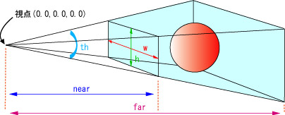 - glFrustum()を使う。この場合、遠近法で投影変換される。遠くのものは小さく、近くのものは大きく描かれ、立体感のある画像を得られる。